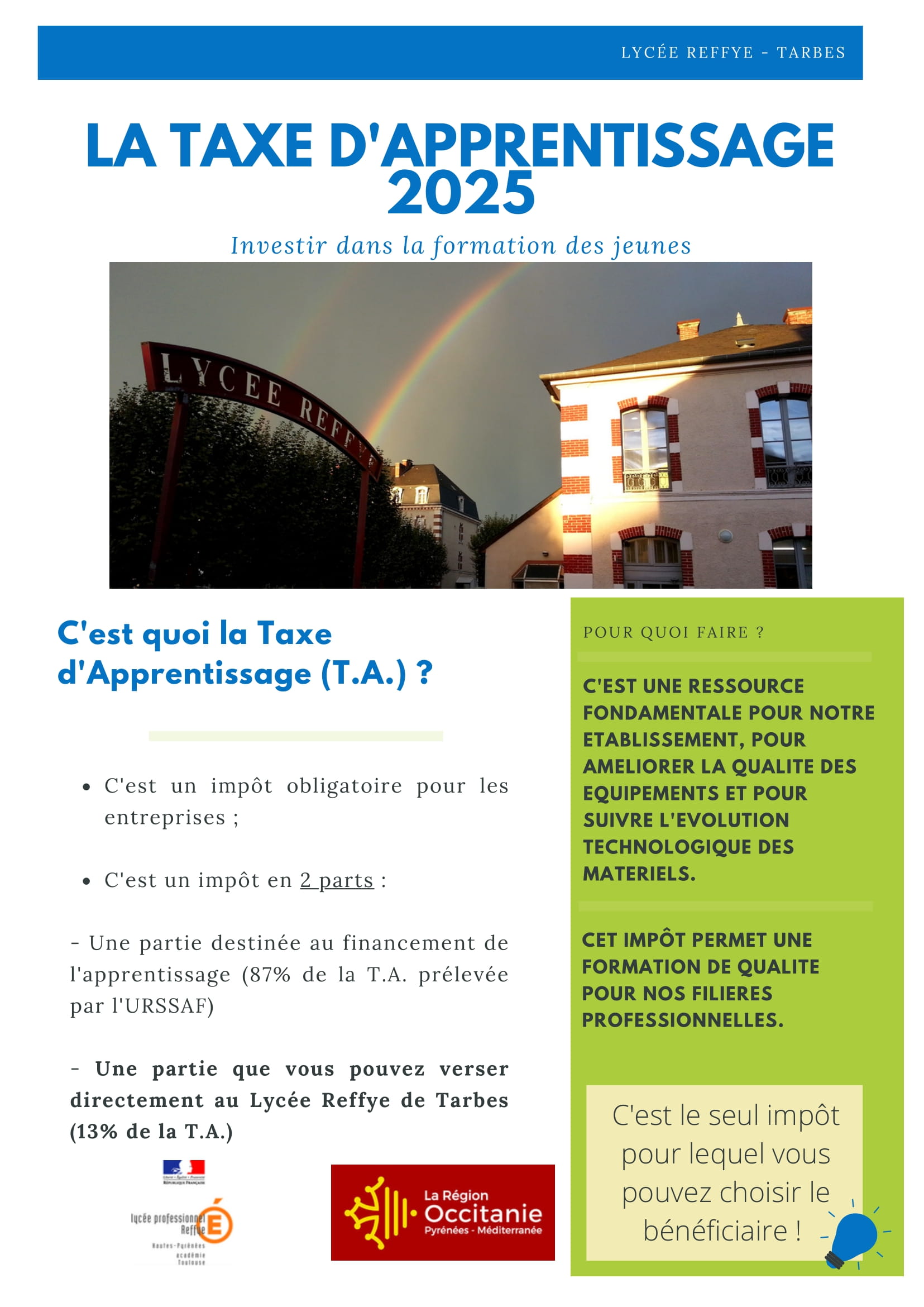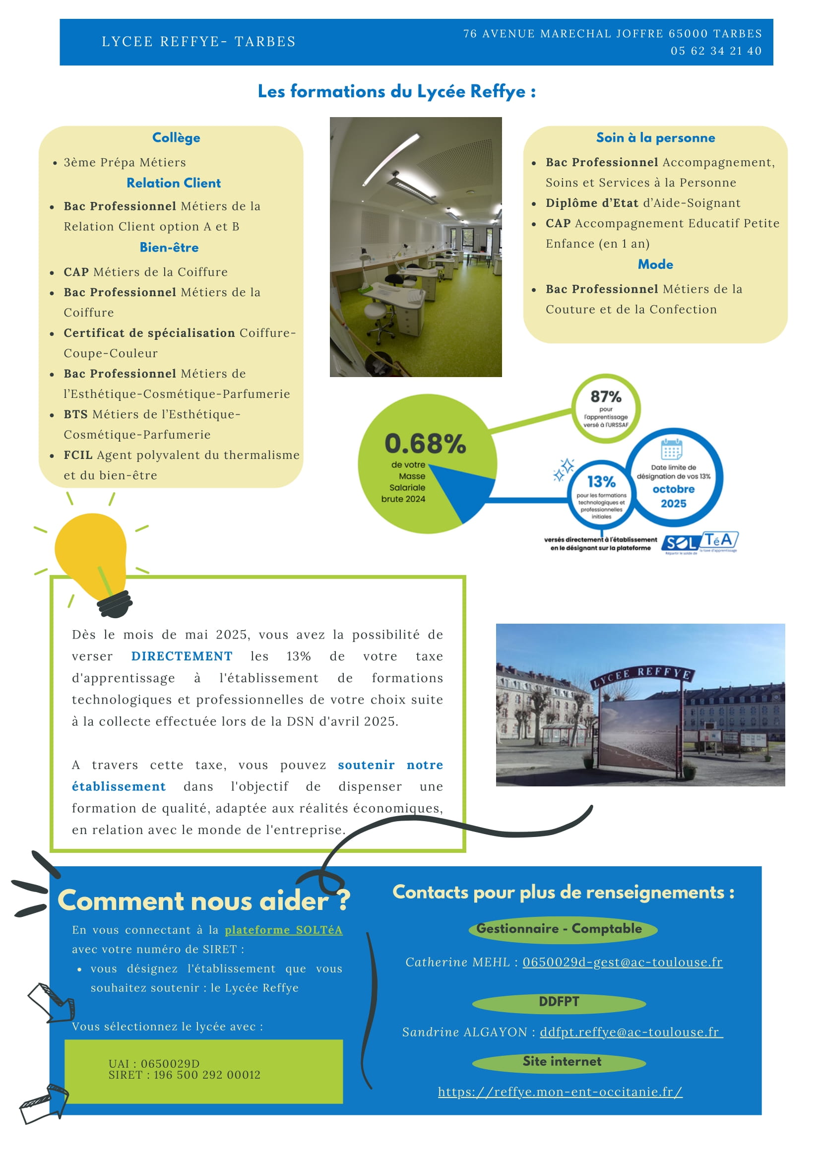 Parents, professeurs, élèves, n’hésitez pas à solliciter dans votre entourage des entreprises en leur demandant de nous verser la taxe d’apprentissage en totalité ou en partie.